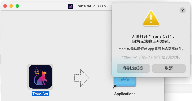 MacOS系统初次安装,无法打开>Trans Cat APP